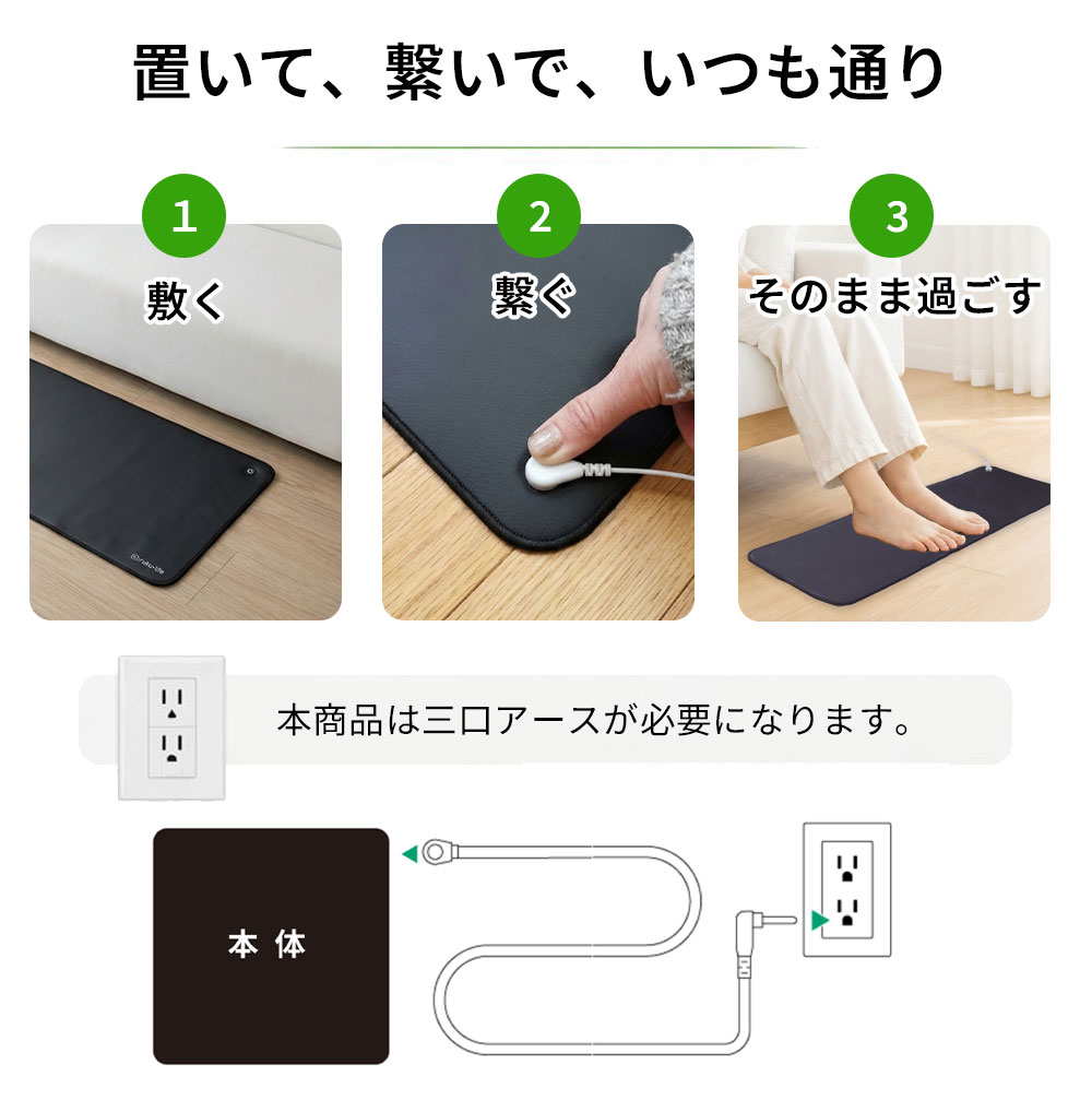 | 接続方法 | マットにボタンでコードを取り付け、もう一方をご家庭の三口コンセントのアース穴に差し込むだけの簡単接続です。 |