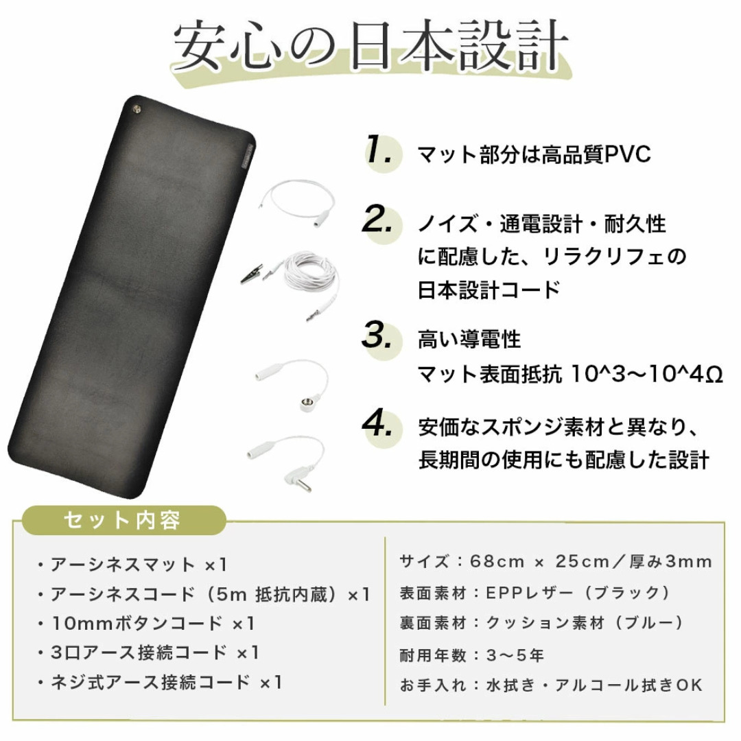 商品概要 リラクリフェのオリジナル Earthiness Mat アーシネスマット (EPPレザータイプ)は、上質なEPPレザーを使用した、ソファーの革のような肌触りを提供するマットです。このマットは、特許技術を採用し、アーシングを考慮した設計により、リラックスできる快適な環境づくりをサポートします。