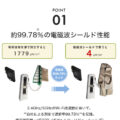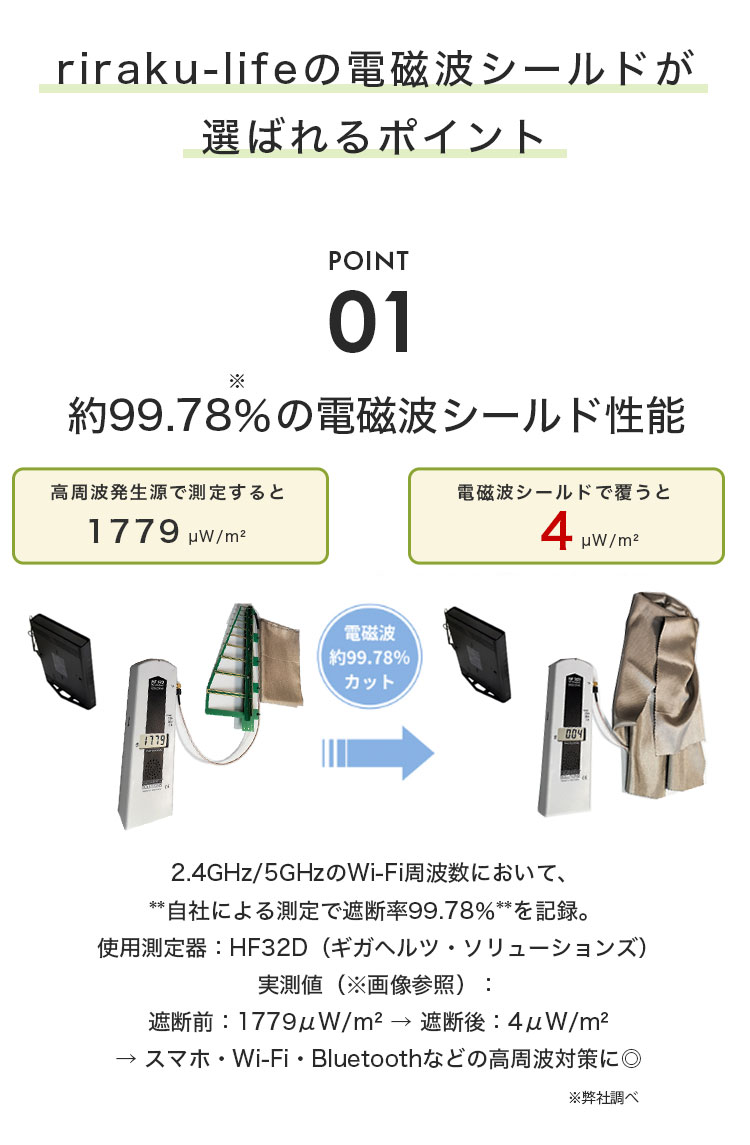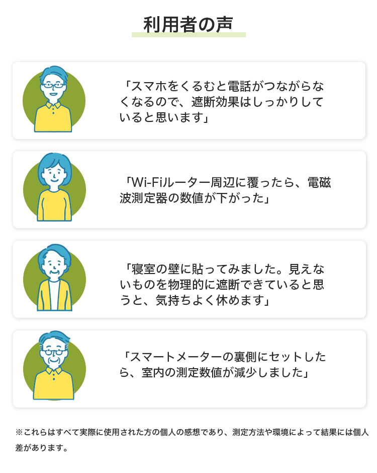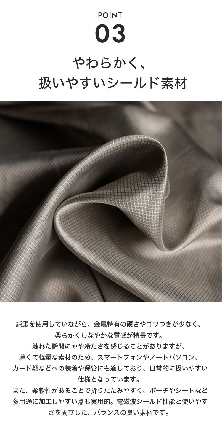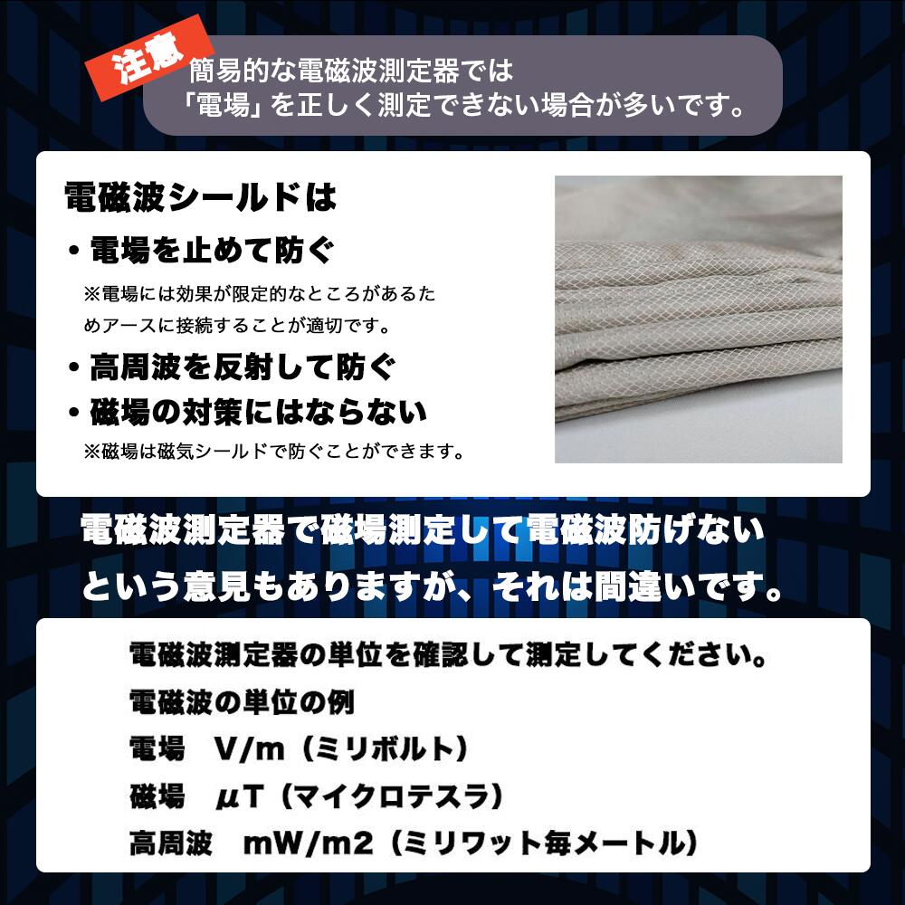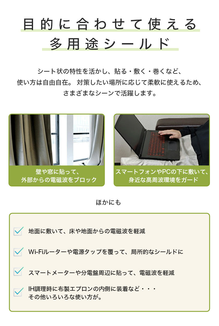 | 使用方法 | ・携帯電話を包んだり、床やベッドの下に敷いたり、壁に貼ったりして電磁波を防ぐことができます。 ・お財布やカードを包むことでスキミング対策にも有効です。 ・生地は柔らかく、裁断や縫製も可能です。 ・アースに接続することで電場の除去が可能です。当社の専用コード(別売り)をお使いください。 |