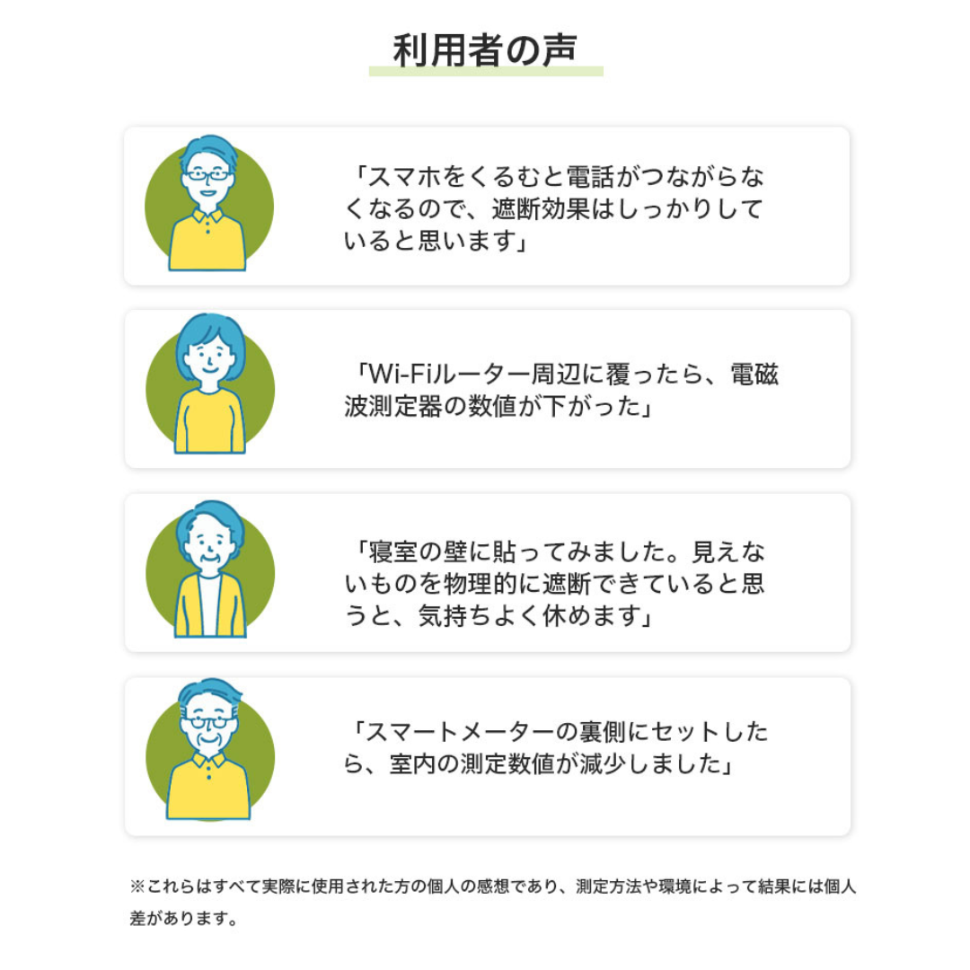 | 使用方法 | ・携帯電話を包んだり、床やベッドの下に敷いたり、壁に貼ったりして電磁波を防ぐことができます。 ・お財布やカードを包むことでスキミング対策にも有効です。 ・生地は柔らかく、裁断や縫製も可能です。 ・アースに接続することで電場の除去が可能です。当社の専用コード(別売り)をお使いください。 |