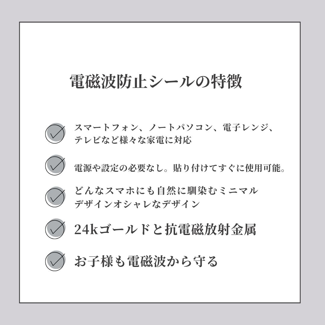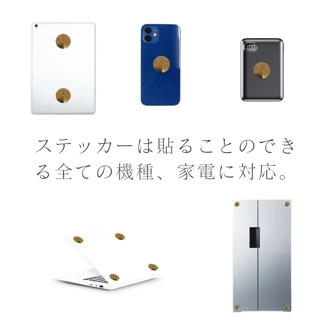 | 使用方法 | スマートフォン、ノートパソコン、Wi-Fiルーター、その他各家電など、電磁波が気になるデバイスに貼り付けてください。しっかりとした接着面に固定することで、安定した使用が可能です。 |
