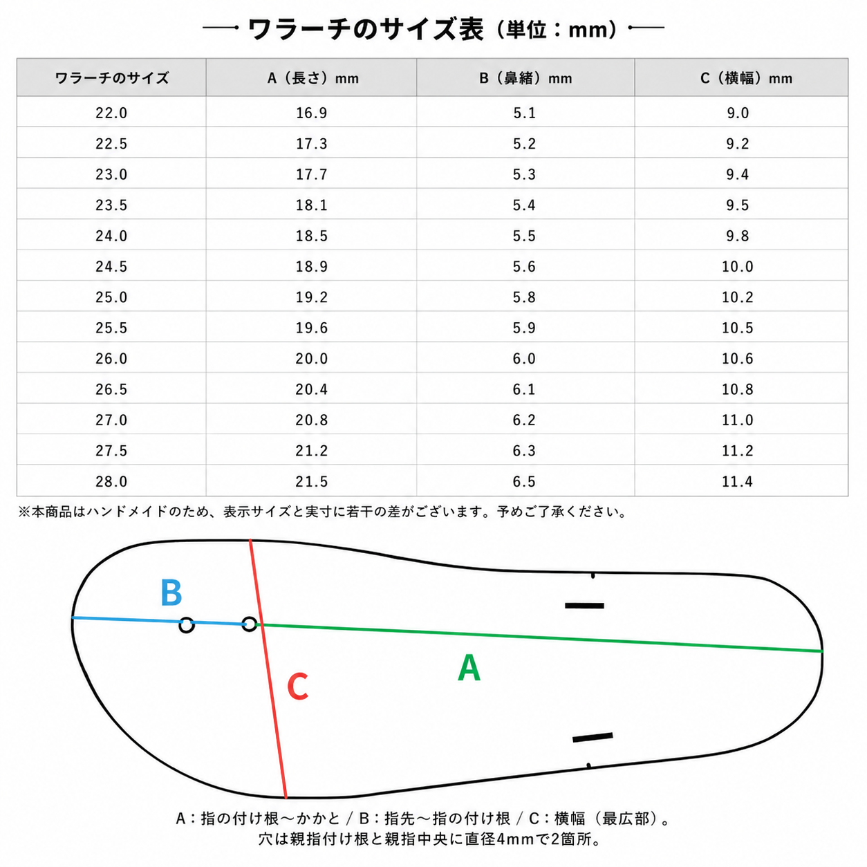 riraku-lifeスタッフが1点ずつ手作業で仕上げたワラーチです。